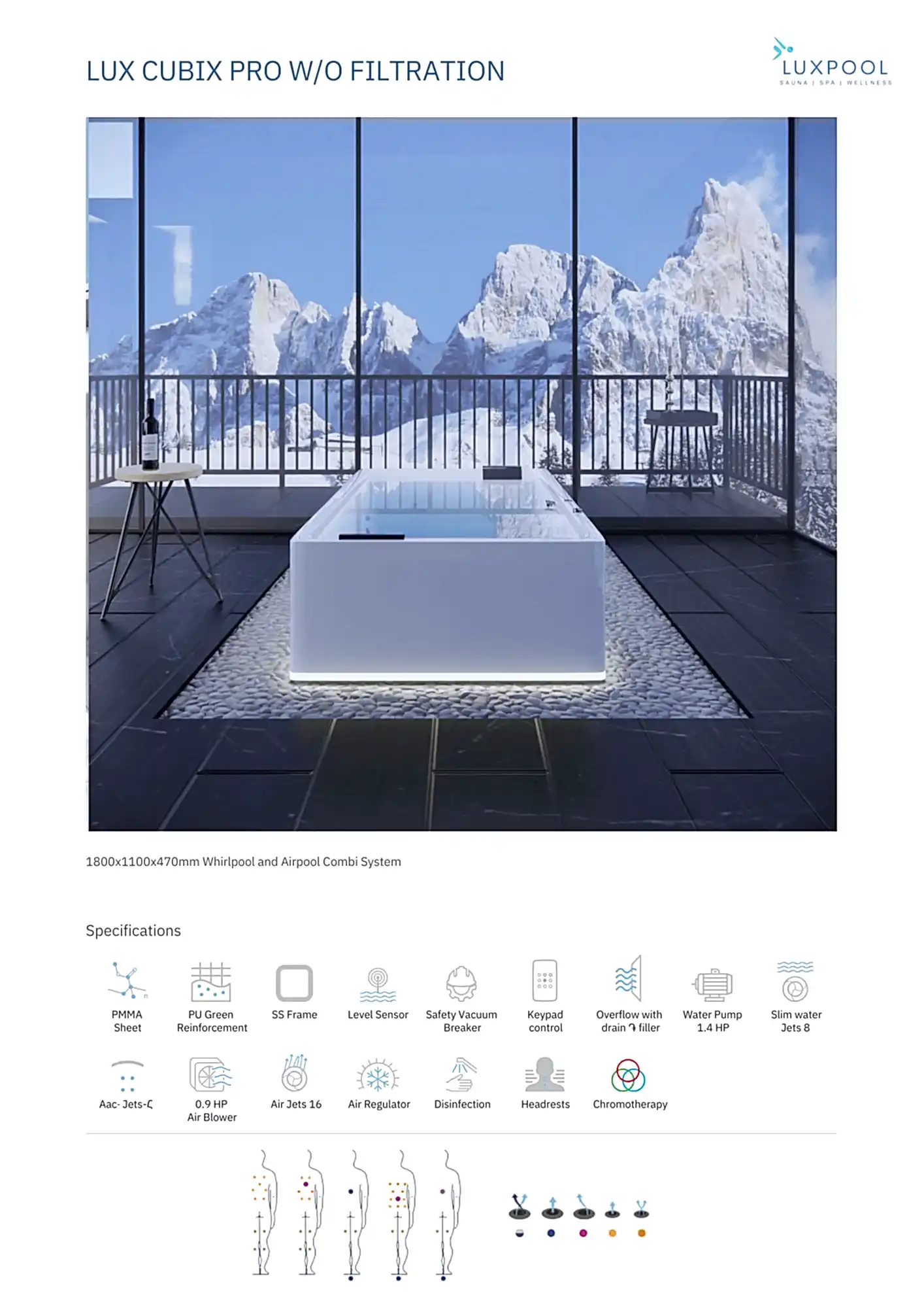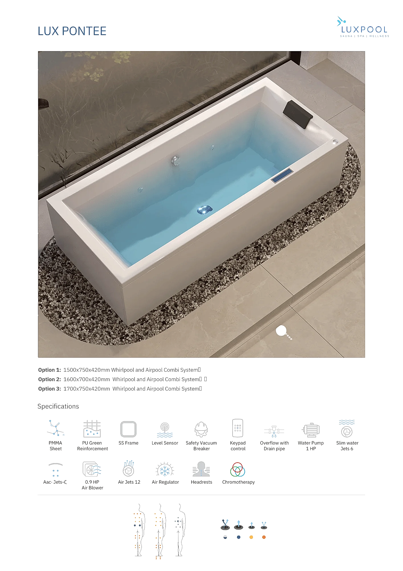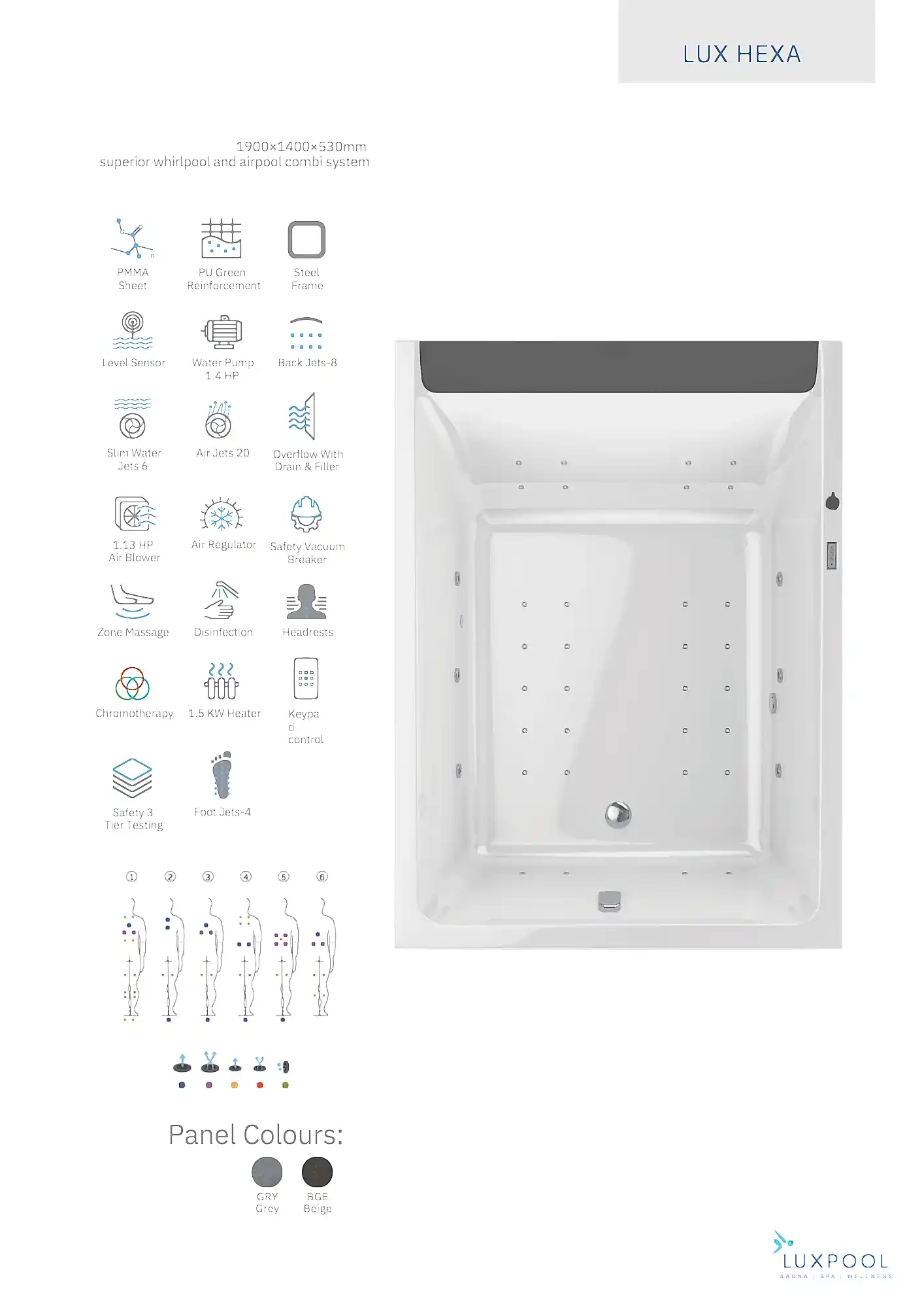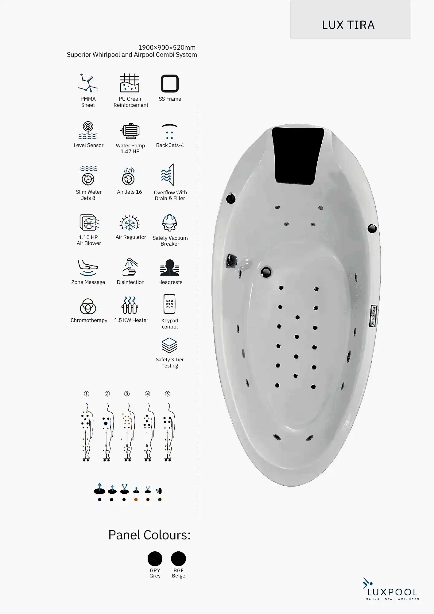 Hydro Whirlpool delivers balanced hydrotherapy by combining adjustable water jets with gentle air bubble (airpool) action, creating a comfortable and effective relaxation experience designed for everyday use, which include;