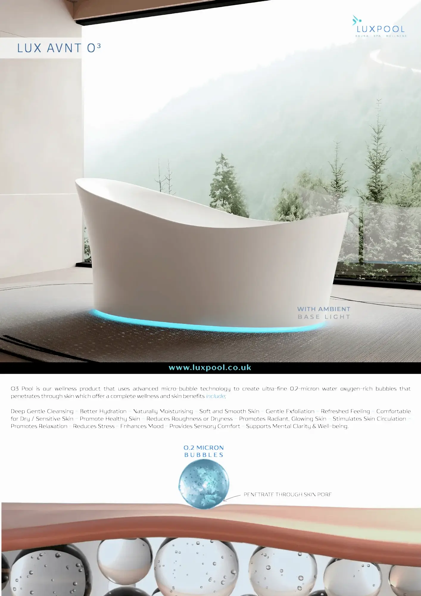 O3 Pool is inspired by research in balneology and modern microbubble water technology. Studies in wellness spa show that ultra-fine oxygen bubbles gently interact with the skin over a large surface area, helping promote comfort, relaxation, and a soft, refreshed skin feel. O3 Pool brings these research-inspired principles into a refined, everyday wellness bathing experience.