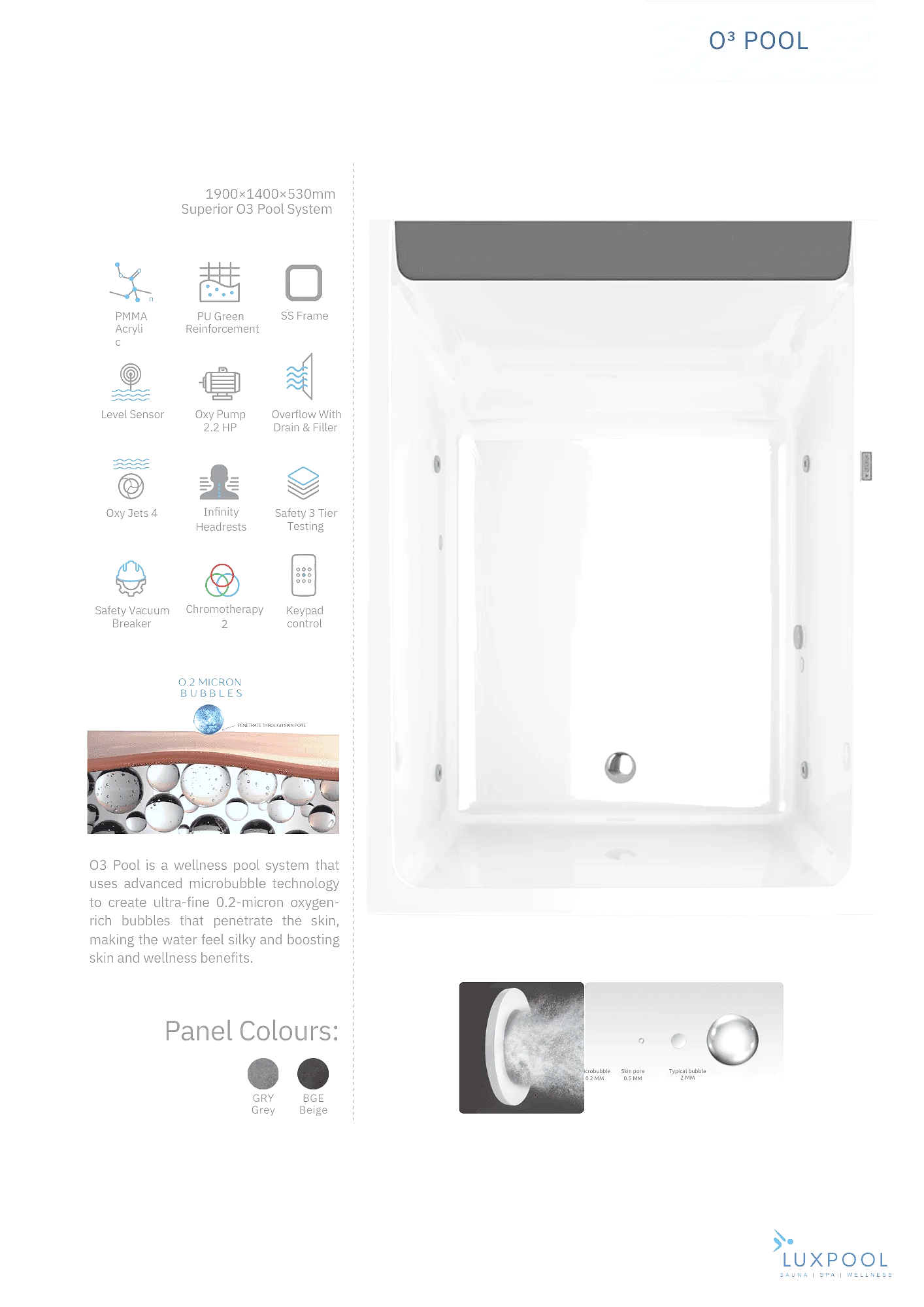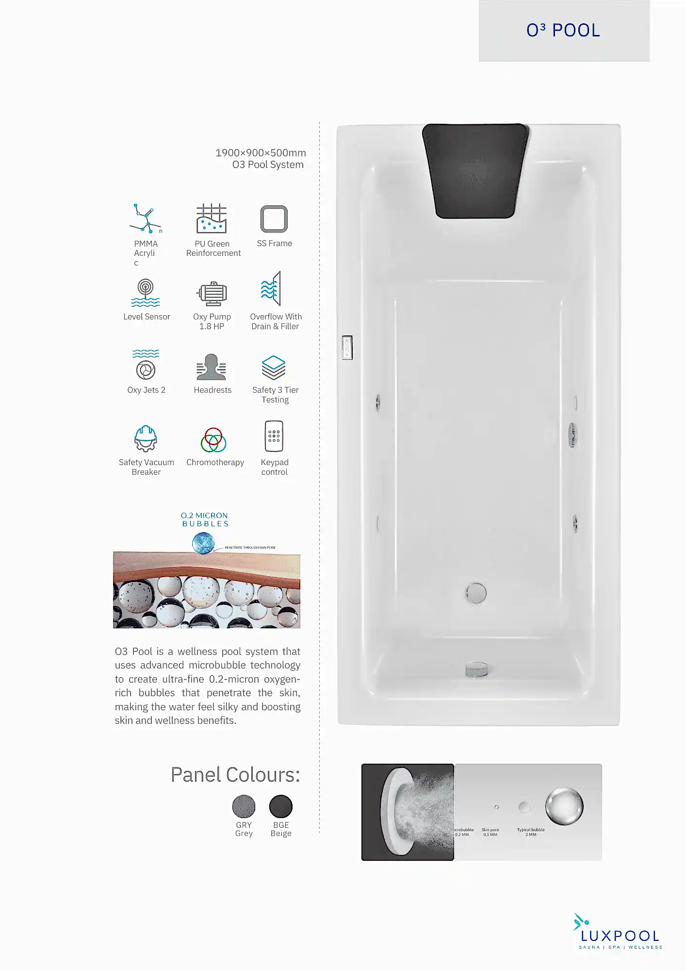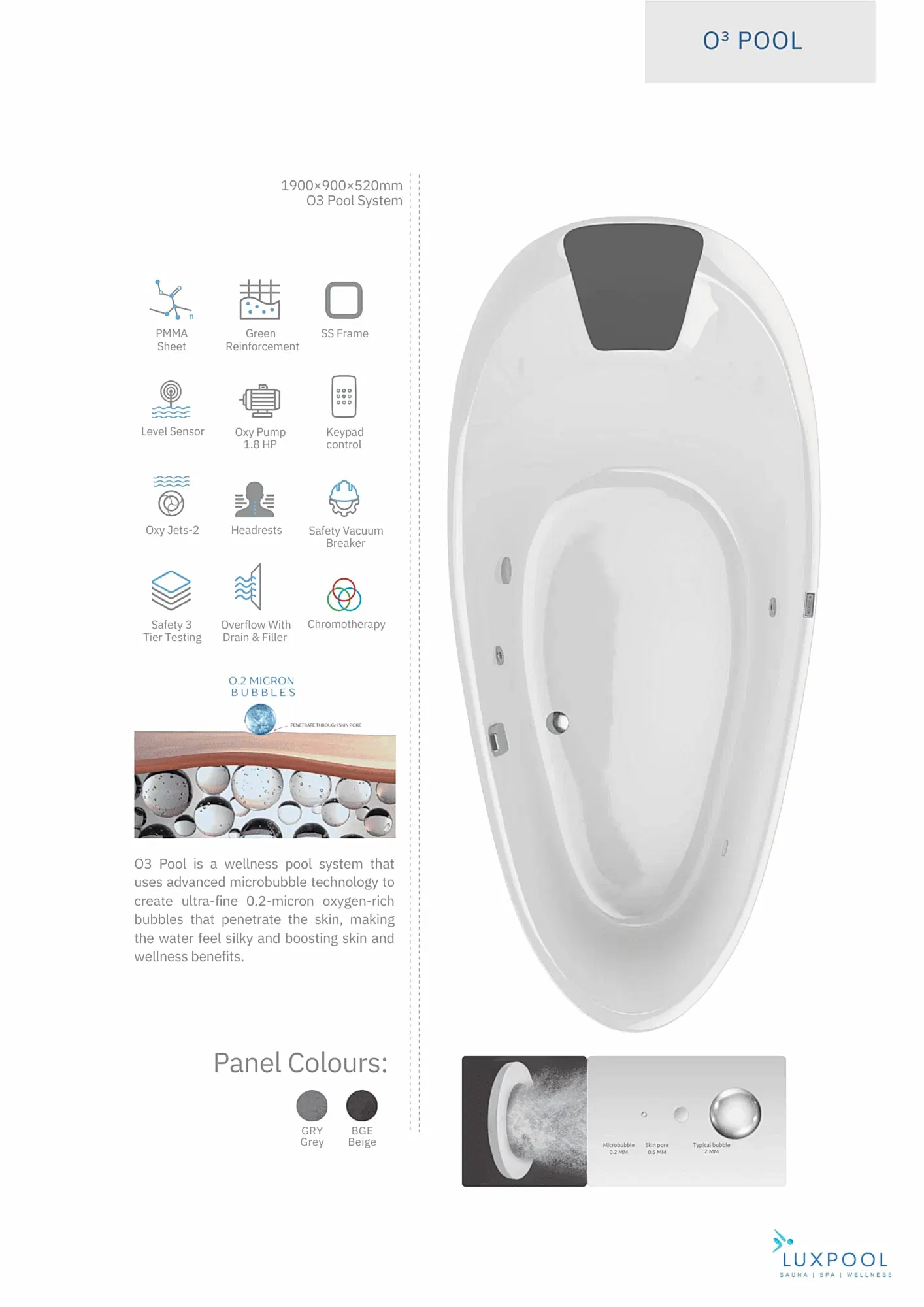 This is more than a standard bathing. O3 Pool function as a personal oxygen wellness spa, created to support skin hydration, relaxation, and overall comfort. All technology is fully integrated into a single one piece system, combining refined design with advanced bathing innovation.